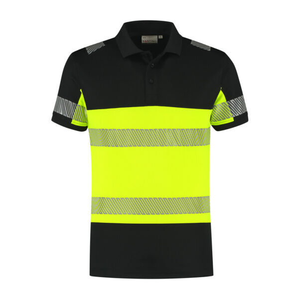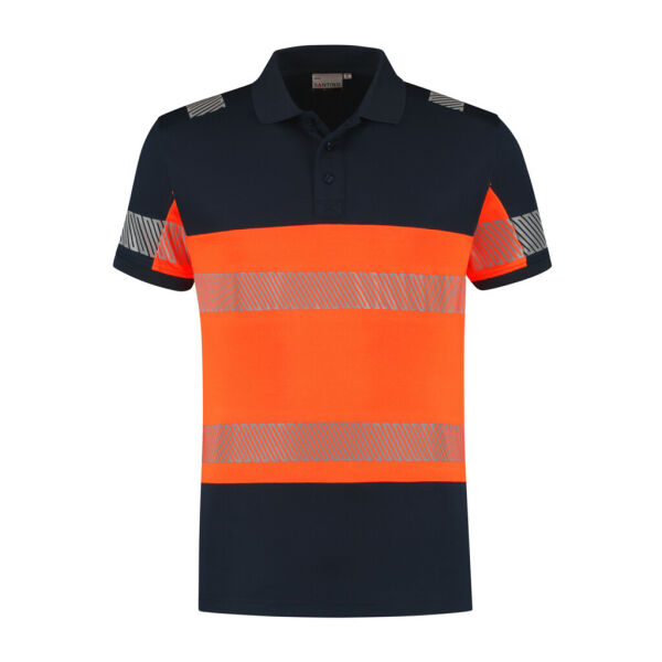 Fluorescerende veiligheids-poloshirt conform de Europese norm EN 17353:2020 - AB3, double face materiaal: 45% gerecycled polyester (buitenzijde) / 55% katoen (binnenzijde), RCS gecertificeerd, 185 gr/m2, unisex, piqué, modern fit, plat gebreide polo- ribkraag met 3- knoopsluiting, korte mouw in 1x1 rib met elastaan, reflecterende gesegmenteerde LOXY tape op de schouder, mouw en rondom het lichaam. Splitjes in de zijnaad.