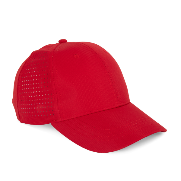 100% polyester. Pet met 6 panelen. De 4 achterste panelen kregen gelaserde microgaatjes om een optimale ventilatie te verzekeren. De zonneklep is afgerond. Deze pet kreeg een regelbare sluiting met klittenband.