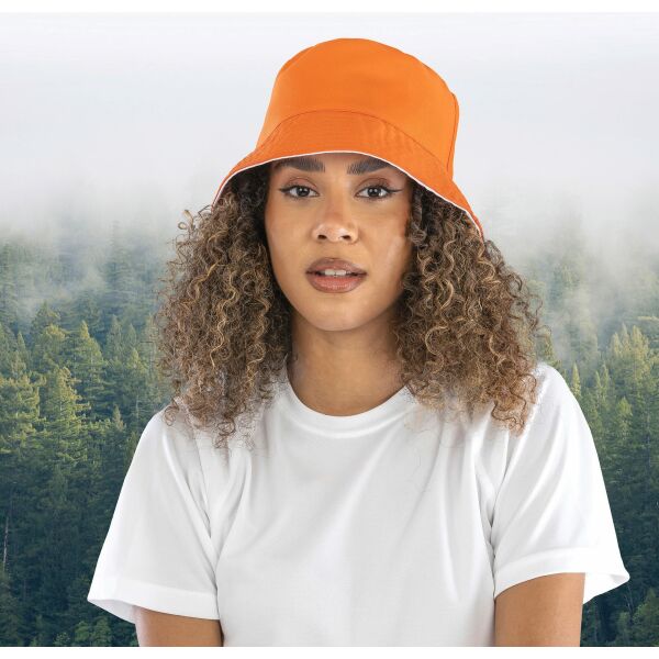 100% gerecycled polyester twill. Reversibele bob met 2 panelen. Brede ronde band. Dubbele rand met 8 stiksels.