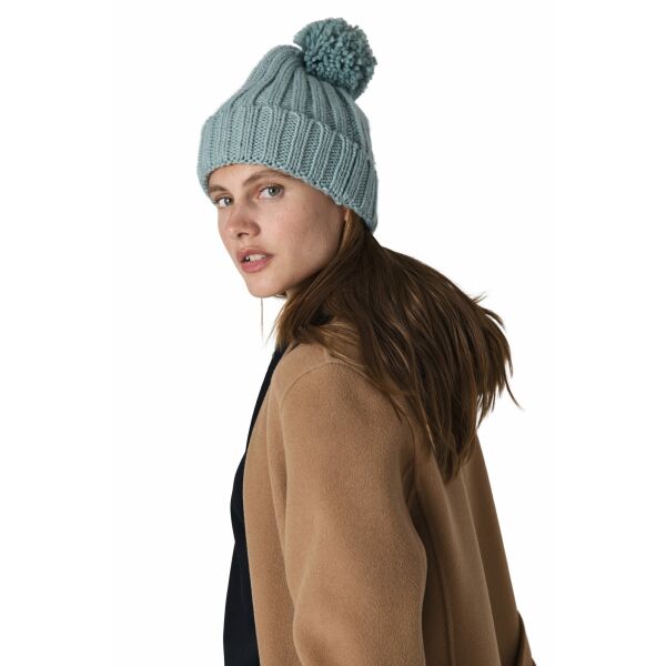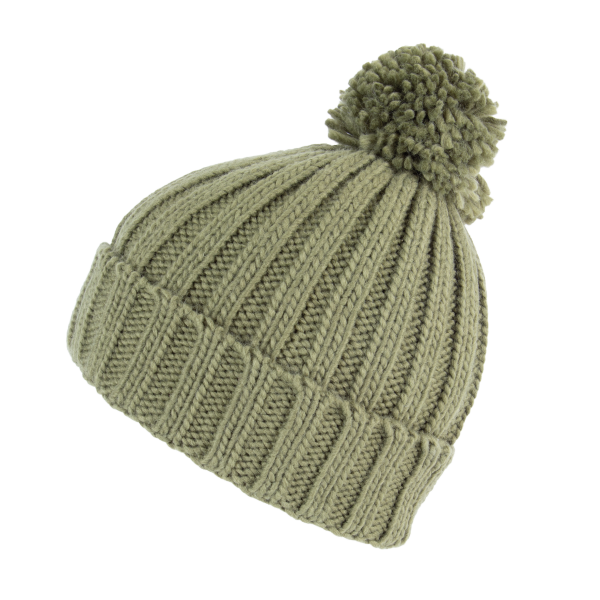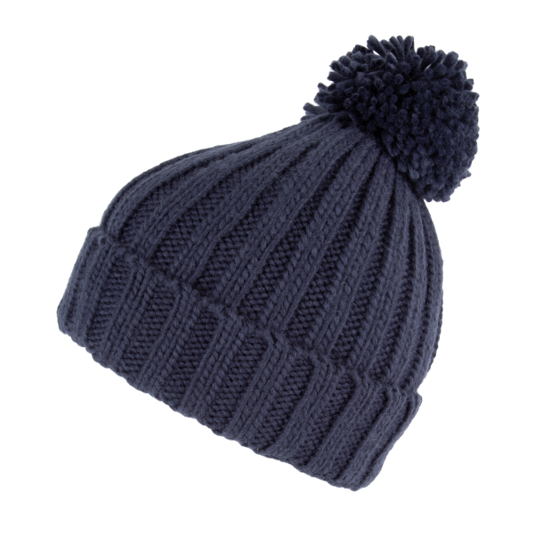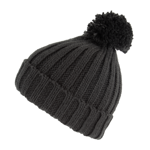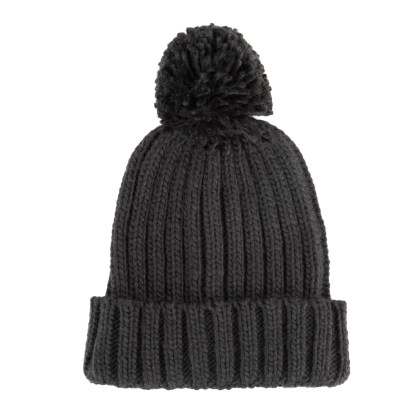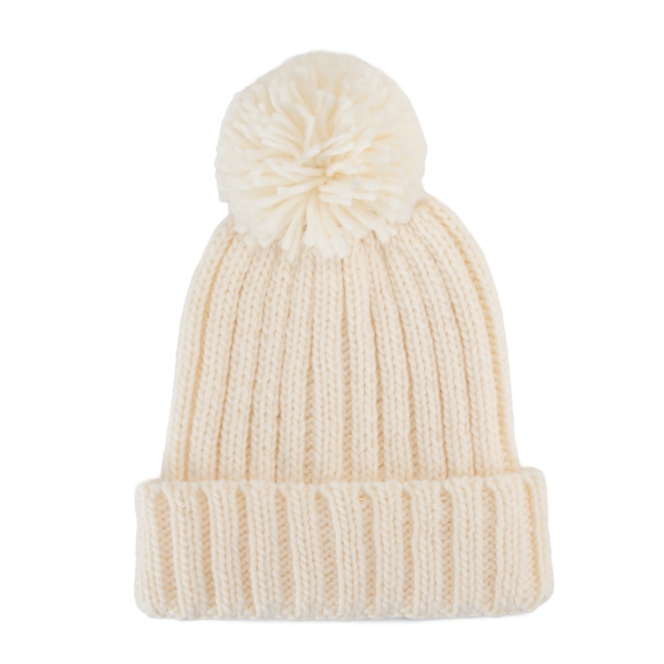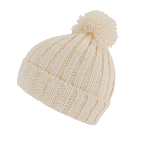 100% acryl. Gebreide muts met pompon. 2x2 ribboord en omslag.